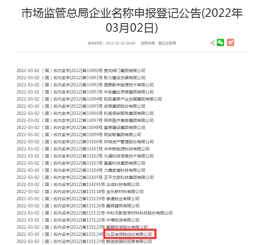 【環球網財經記者 陳超】日前,國家市場監督管理總局,發佈市場監管總局企業名稱申報登記公告,正式核准“比亞迪保險經紀有限公司 ”。目前,該公司尚未進行工商註冊,銀保監會也尚未批准。