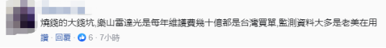 對於美國竄訪團的這個“建議”,有島內網友批評,“一個錢坑不夠,又要被推入新的錢坑了。” “燒錢的大錢坑,樂山雷達光是每年維護費幾十億都是台灣買單,監測資料大多是老美在用。”