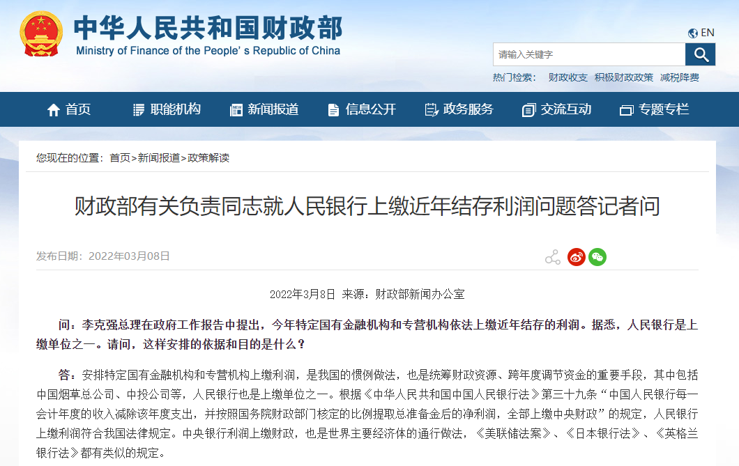 就人民銀行上繳近年結存利潤問題,財政部有關負責人答記者問表示,安排特定國有金融機構和專營機構上繳利潤,是我國的慣例做法,也是統籌財政資源、跨年度調節資金的重要手段,其中包括中國煙草總公司、中投公司等,人民銀行也是上繳單位之一。
