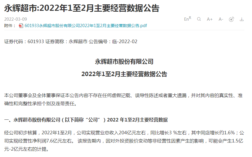 【環球網綜合訊】生鮮超市龍頭永輝超市3月8日晚發佈了史上首份月度經營數據公告。數據顯示,1-2月,公司實現營業總收入204億元左右,同比增長3%左右,其中,同店增長約1.6%;實現經營性淨利潤7.6億元左右。該報告期內,因對外投資股價變動等非經營性因素產生的影響,可能會產生1.5億元-2億元左右的計提。