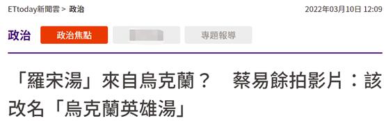 據“ETtoday新聞雲”報道,蔡易餘聲稱,為表達對烏克蘭支持,他與台南市議員擬參選人王宣貿、新北市議員擬參選人張嘉玲一起拜訪大廚黃育芯,製作烏克蘭道地的湯品,還要將過去上海所命名的“羅宋湯(Russian Soup)”正名為“烏克蘭英雄湯”。