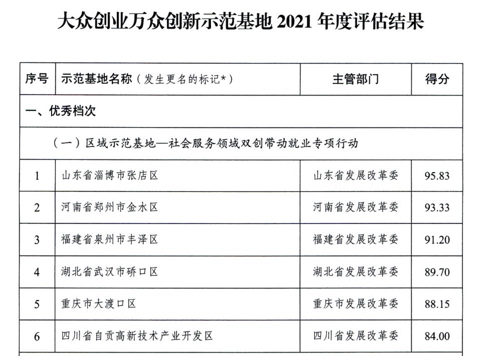 近日,國家發展和改革委員會同中國科學技術協會公佈了大眾創業萬眾創新示範基地2021年度評估結果,河南省鄭州市金水區在優秀檔次的“區域示範基地—社會服務領域雙創帶動就業專項行動”中,以93.33分高居第二。