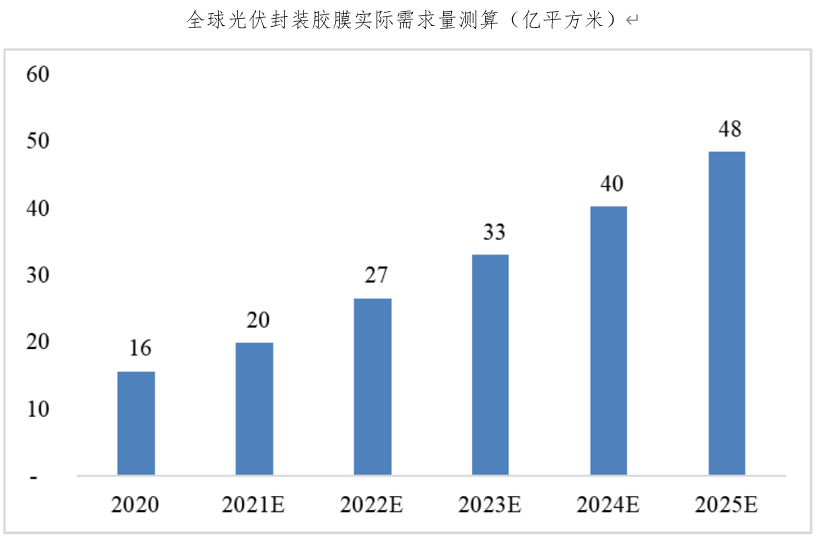 全球光伏市場呈持續增長態勢,對光伏膠膜的市場需求亦隨之快速增長。根據中金公司研究部預測數據,2021年全球光伏膠膜需求量接近20億平方米,到2025年全球光伏膠膜需求量可達48億平方米,較2020年提升約210%,未來市場空間廣闊。