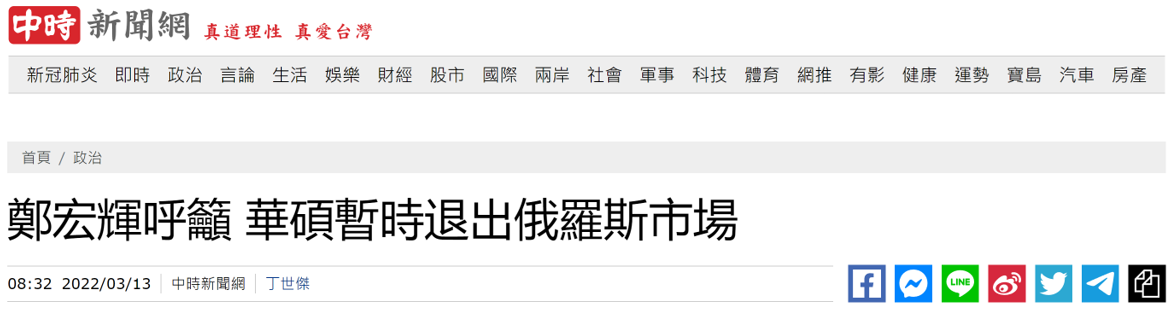 鄭宏輝還聲稱,建議華碩與所有在俄設立分支的台灣企業,應該立刻響應撤出行動,“一致抵制俄羅斯”。