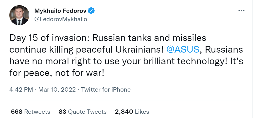 據報道,費多羅夫日前發推特稱,希望華碩加入制裁俄羅斯的行列。他稱,“信息業通常對於‘和平與民主’,都會給予高度支持,因此,他希望華碩也能暫停其在俄羅斯營運業務,不再對該國提供硬件與電子供應以及相關技術服務”。