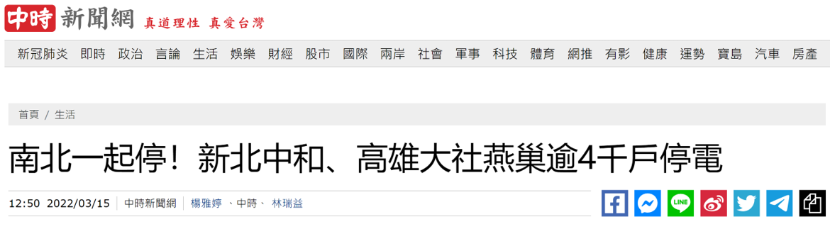 快訊!台媒:台灣南北一起停,新北、高雄超4000户停電
