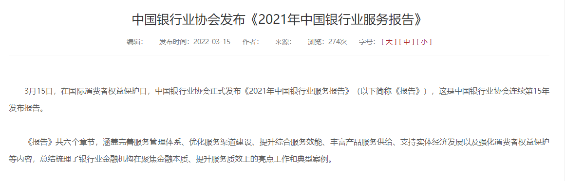 【環球網財經訊】3月15日,在國際消費者權益保護日,中國銀行業協會正式發佈《2021年中國銀行業服務報告》(以下簡稱《報告》),總結梳理了銀行業金融機構在聚焦金融本質、提升服務質效上的亮點工作和典型案例。