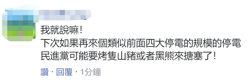 也有網友表示,“我就説嘛!下次如果再來個類似前面四大停電的規模的停電,民進黨可能要烤只山豬或者黑熊來搪塞了!”↓