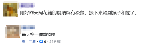 對此,有島內網友諷刺,“剛好昨天王美花給的選項就有松鼠,接下來輪到猴子和蛇了”、“每天換一種動物嗎”。↓