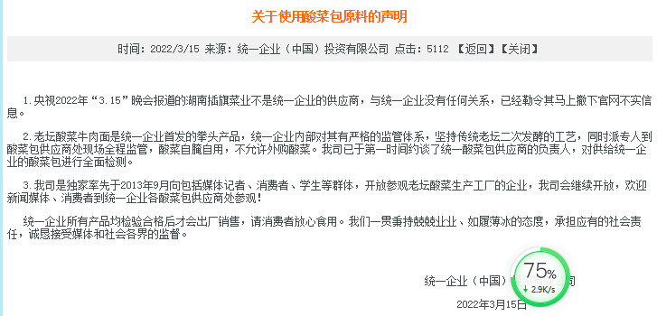 統一企業稱,老壇酸菜牛肉麪是其首發的拳頭產品,統一企業內部對其有嚴格的監管體系,堅持傳統老壇二次發酵的工藝,同時派專人到酸菜包供應商處現場全程監管,酸菜自醃自用,不允許外購酸菜。公司已於第一時間約談了統一酸菜包供應商的負責人,對供給統一企業的酸菜包進行全面檢測。