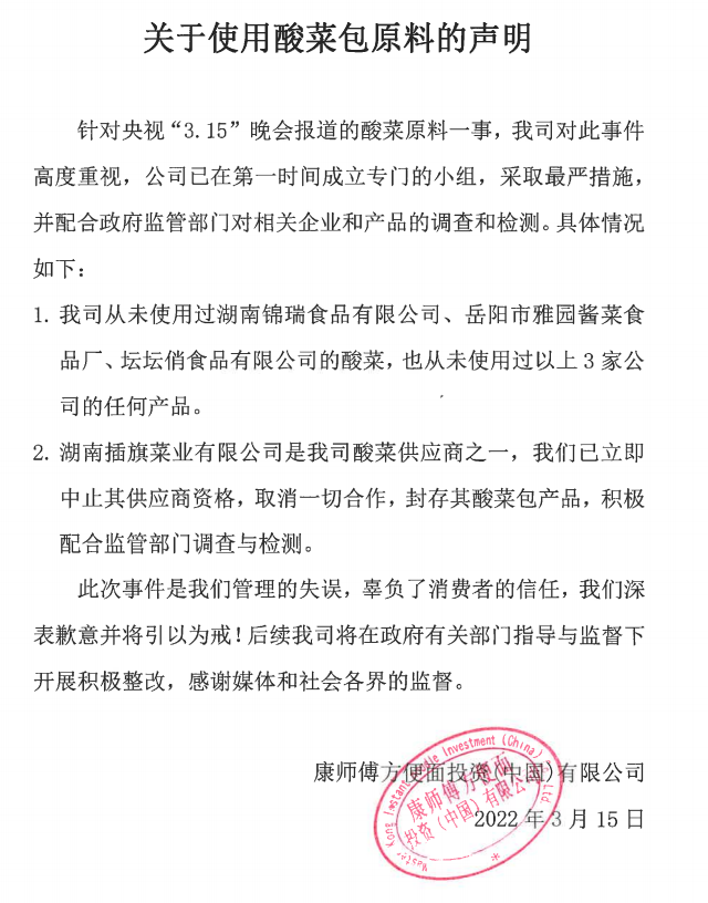康師傅3月15日發佈聲明稱,針對央視“3.15”晚會報道的酸菜原料一事,公司已成立專門小組,採取最嚴措施,並配合政府監管部門對相關企業和產品的調查和檢測。公司從未使用過湖南錦瑞食品有限公司、岳陽市雅園醬菜食品廠、壇壇俏食品有限公司的酸菜,也從未使用過以上3家公司的任何產品。湖南插旗菜業有限公司是公司酸菜供應商之一,公司已立即中止其供應商資格,取消一切合作,封存其酸菜包產品,積極配合監管部門調查與檢測。