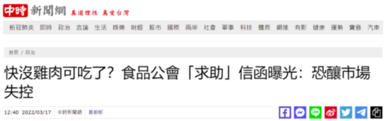 中時新聞網稱,台灣農業專家“Lin bay 好油”16日在臉書貼出“台灣區冷凍食品工業同業公會”發給“農委會”的函,稱會員反映各地暴發禽流感疫情,導致近期雞肉供給數量將出現短缺,恐有造成消費市場失控之虞。