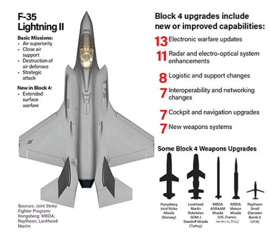據稱,Block 4升級項目包括大約53項改進以“應對中國和俄羅斯的空中和地面防空威脅”,重點是不改變外觀而是增強軟件執行能力。原先預計從2019年開始對現有F-35機隊進行升級,直到2024年完成全體升級,但現在項目完成時間已經延期到2029年,而且還存在諸多不成熟的地方。