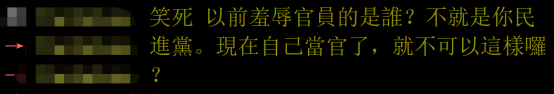 此外,相關話題也在島內論壇PTT引起討論,不少網友對蘇貞昌的相關言論表示質疑,有網友表示,“笑死,以前侮辱官員的是誰?不就是你民進黨,現在自己當官了,就不可以這樣了?” “哦,那不就是以前民進黨把官員當狗的時代”、“以前的我(指蘇貞昌)可以罵人,現在的我不給罵,呵呵”。↓