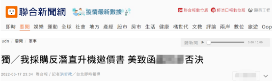 台灣《聯合報》稱,台外事部門負責人吳釗燮前天(16日)宣佈美國將對台軍售,但據美軍備業界透露,美國國務院已於日前正式致函台防務部門,否決台軍所謂“神鷹三號”計劃(即台軍準備向美求購12架MH-60R海鷹反潛直升機的“邀價書”),該採購案有待台軍方高層決定,恐面臨撤案。台防務部門17日回應稱,對於評估或洽談中的軍購案,依慣例不評論。