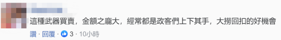 還有網友表示,“這種武器買賣,金額之龐大,經常都是政客們上下其手,大撈回扣的好機會”。↓