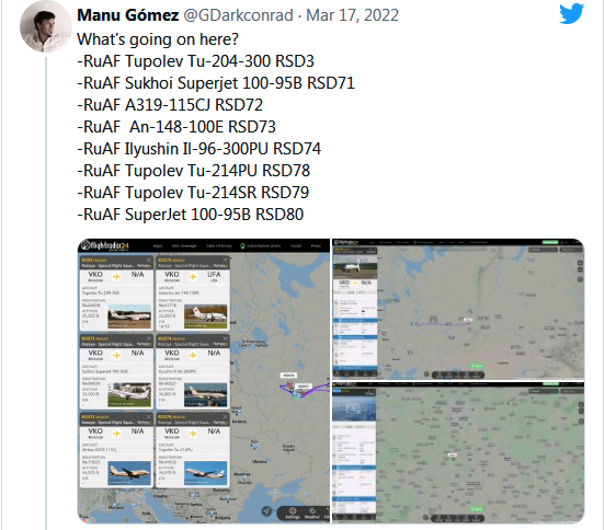 美國“航空家”網站17日稱,通過在線航班追蹤網站發現,隸屬俄空天軍和俄特種飛行中隊的共計22架飛機突然集體從莫斯科附近機場起飛,飛往包括鄂木斯克、烏髮、新西伯利亞和秋明等俄羅斯東南方向。