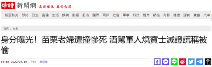 【環球網綜合報道 記者趙友平】台灣中時新聞網消息稱,台灣苗栗市76歲劉姓老人今天(19日)清晨在南苗市場附近路口被一輛奔馳車衝撞致死,肇事車主袁姓男子逃逸後縱火燒車毀滅證據,並騙父親説車子被偷。警方通知袁姓男子到案,該男子一度不認罪,經警方追查才坦承酒後肇事。報道稱,該男子為現役軍人。