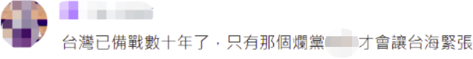 還有網友説,台灣已備戰數十年了,只有那個爛黨“執政”才會讓台海緊張。↓