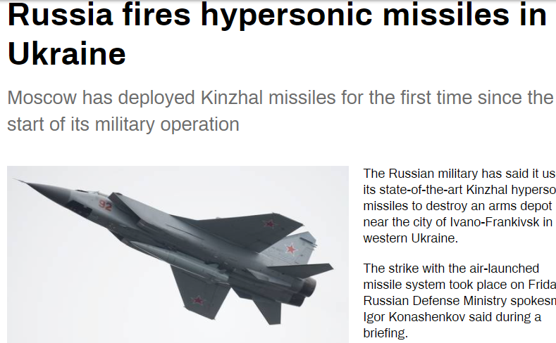 為了對付烏克蘭西部的“高價值”目標,俄羅斯軍隊18日動用了傳説中的大殺器——“匕首”高超音速導彈。這是俄羅斯首次在烏克蘭使用這種號稱“無法攔截”的導彈。