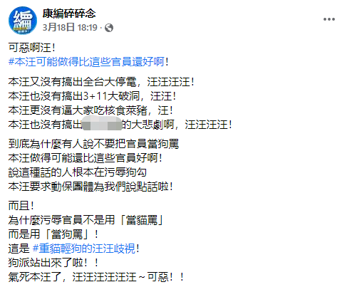 帖文則以狗的視角稱:可惡啊!本汪可能做得比這些官員還好啊!本汪又沒有搞出全台大停電!本汪也沒有搞出3+11大破洞!本汪更沒有逼大家吃核食、萊豬(含瘦肉精的美豬)!本汪也沒有搞出‘斷交8國’的大悲劇啊!