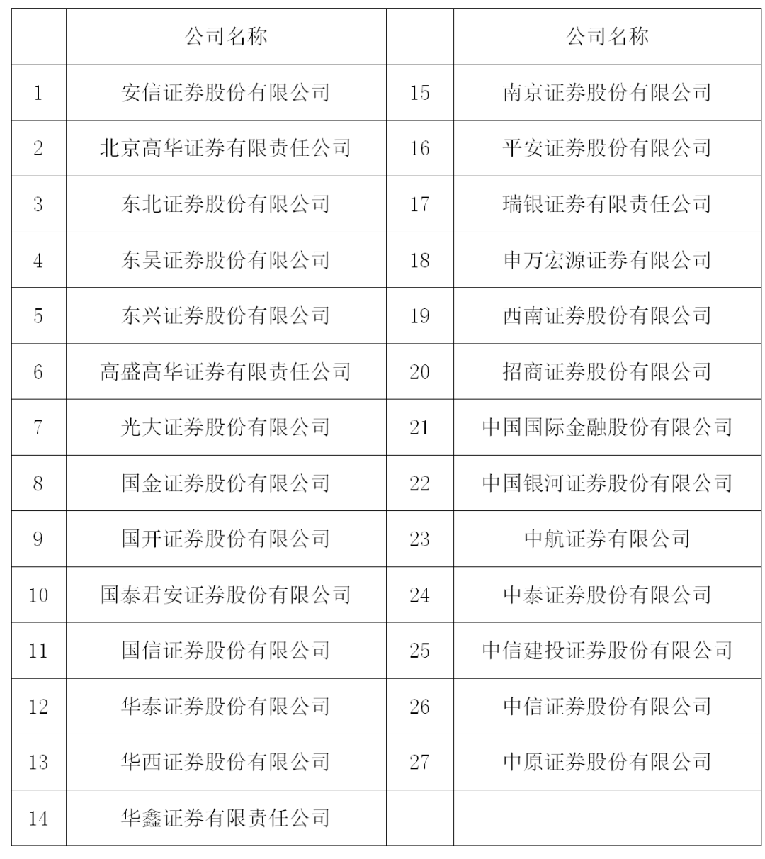 此次入圍證券公司“白名單”的券商合計27家,中信證券、中金公司、南京證券、東興證券、瑞銀證券、高盛高華等頭部、中小、外資券商均有入圍。不過與2021年12月發佈的證券公司“白名單”相比,此次“白名單”有3家券商被調出,分別是華寶證券、西部證券和浙商證券。