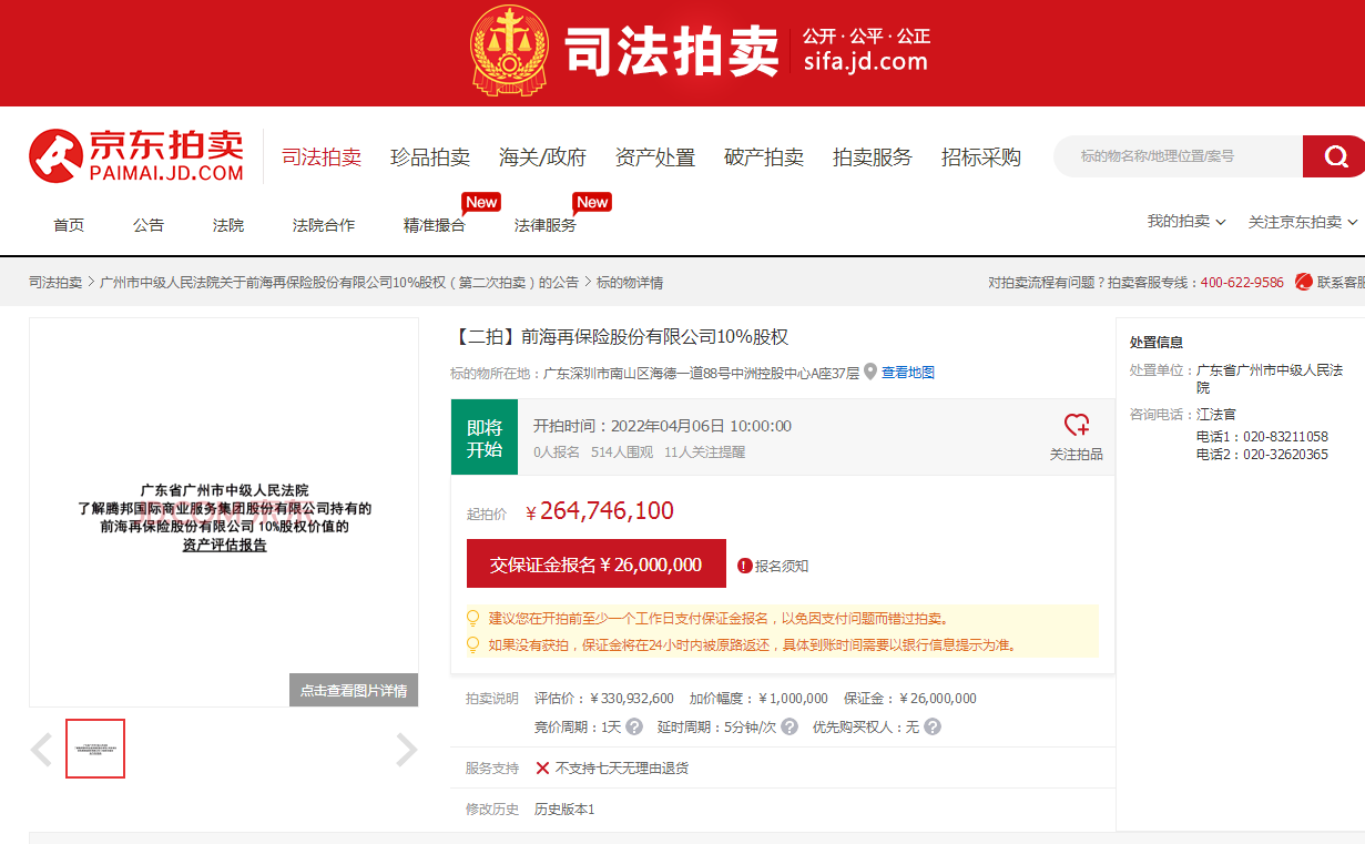【環球網財經資訊】近日,環球網記者從京東司法拍賣平台獲悉,前海再保險股份有限公司(以下簡稱“前海再保險”)10%股權將於4月6日再次在平台進行拍賣,起拍價格2.65億元。