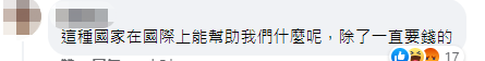 還有人在臉書留言稱,“來要錢的嗎?”“這種國家在國際上能幫助我們什麼呢,除了一直要錢。”、