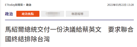 【環球網報道】台灣所謂“友邦”馬紹爾羣島共和國總統戴維·卡布阿21日起竄訪台灣。據中時新聞網、“ETtoday新聞雲”等台媒報道,馬紹爾國會日前通過一項“挺台”決議案,卡布阿今日(22日)與台當局領導人蔡英文會面時,向蔡遞交決議文正本,內容包括馬紹爾呼籲聯合國終結將台灣排除在外的“不當”舉措。對此,有島內網友忍不住吐槽,“隨便拿一張紙換錢嗎?”