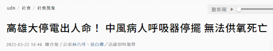 台媒:“303”大停電,高雄有民眾因呼吸機無法供氧導致死亡