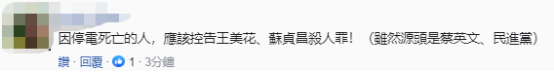 有人説,“因停電死亡,應該控告王美花(台‘經濟部長’)、蘇貞昌(台‘行政院長’)殺人罪!(雖然源頭是蔡英文、民進黨)”