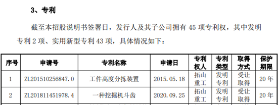 根據招股書披露,公司擁有較強的技術創新能力,為高新技術企業,公司的技術中心被安徽省經濟與信息化廳認定為 2020 年第 29 批“安徽省企業技術中心”。但與此同時,招股書披露拓山重工共擁有45項專利中,含金量較高的發明專利僅有2項,而且就連這僅有的2項發明專利,還都是受讓取得,也就是買來的專利。