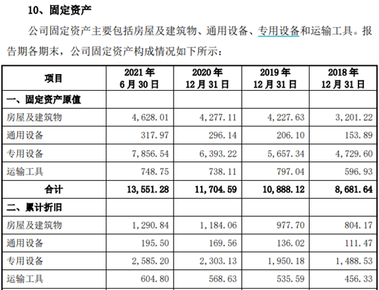 再來看拓山重工的經營數據,根據招股書第266頁披露的固定資產相關信息,公司擁有的專用設備類固定資產,在2021年上半年有較大金額的增加,從2020年末的6393.22萬元增加到2021年上半年末的7856.54萬元,淨增加了近1500萬元、增幅在20%以上。考慮到公司對於專用設備類固定資產基本為10年,這也就意味着在公司的主要設備當中應當存在不少成新率在90%以上的設備。