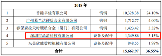 此外,根據招股書第361頁披露的重大合同相關信息,鼎泰高科在2018年與“深圳市品清科技有限公司”簽訂了價款為874萬元的採購合同,有效期為2018年內;但在此基礎,“深圳市品清科技有限公司”以1349.86萬元的採購金額,位列鼎泰高科2018年度第4大供應商的位置,採購金額顯著超過了雙方簽訂的合同金額。