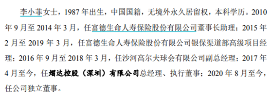 李小菲是鼎泰高科獨立董事,根據招股書披露,李小菲女士生於1987年、本科學歷,此前曾於2010年9月擔任富德生命人壽的董事長助理,彼時李小菲女士年僅23週歲也即大學本科剛畢業,一名剛剛大學本科畢業就擔任一家保險公司的董事長助理,其合理性令人質疑。