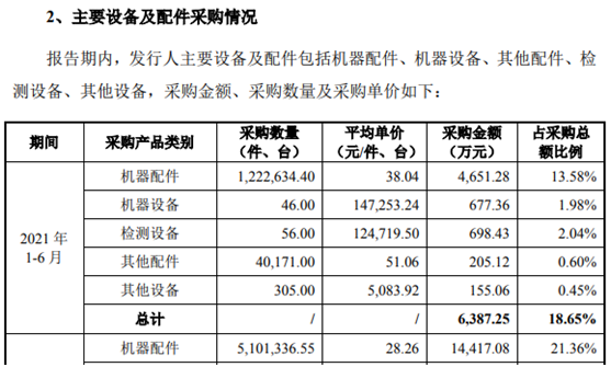 不僅如此,根據招股書第148頁披露的“主要設備及配件採購情況”相關信息,鼎泰高科在2021上半年採購的機器設備金額非常少,僅為677.36萬元。但與此同時,招股書第156頁披露的主要生產設備相關信息中,截至 2021年6月30日“公司正在使用或已購置的單位原值在100萬元以上 的主要生產設備”中,卻存在多項設備成新率高於90%的設備類型,其中僅3台“中央空調製冷機組”的原值就高達1118.27萬元、成新率為92.08%。這也與公司在2021上半年採購機器設備金額總計才677.36萬元的數據不相符。