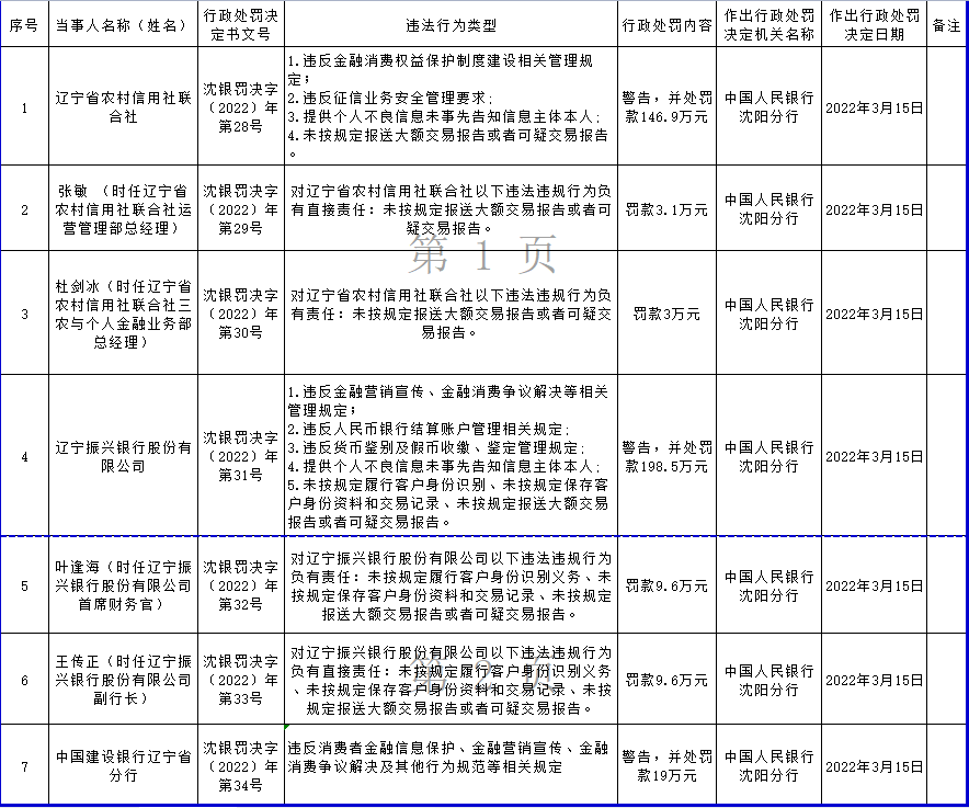 其中,遼寧振興銀行股份有限公司被處罰款198.5萬元,涉五項違法行為,包括違反金融營銷宣傳、金融消費爭議解決等相關管理規定;違反人民幣銀行結算賬户管理相關規定;違反貨幣鑑別及假幣收繳、鑑定管理規定;提供個人不良信息未事先告知信息主體本人;未按規定履行客户身份識別、未按規定保存客户身份資料和交易記錄、未按規定報送大額交易報告或者可疑交易報告。