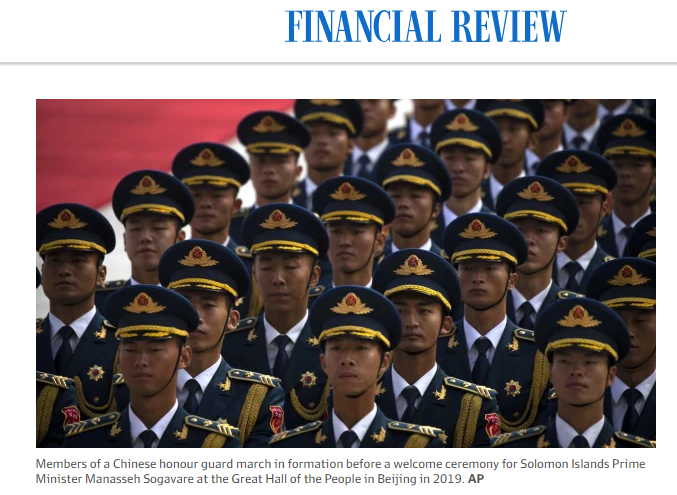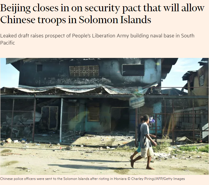 另外,英國《金融時報》也稱,“北京接近與所羅門羣島達成安全協議,允許中國軍隊進入”“泄露的草案提高了中國人民解放軍在南太平洋建設海軍基地的可能性”。