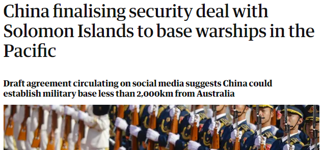 澳大利亞版的《衞報》是爆出這一驚人消息的媒體之一,它24日的報道標題是“中國與所羅門羣島敲定安全協議,要在太平洋部署軍艦”。