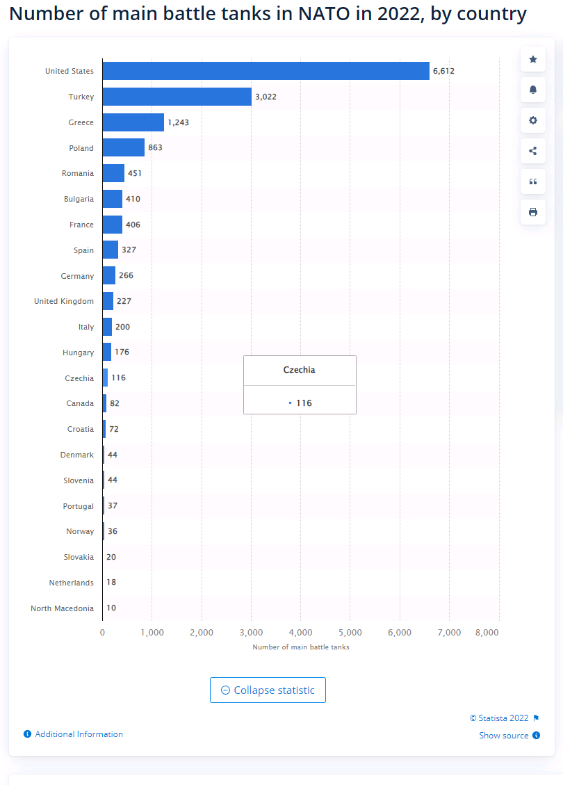 在地面的坦克數量方面,北約的情況同樣糟糕……裝備坦克數量最多的依然是美國,為6612輛,其次為土耳其(3022輛),排名第三的是希臘的1243輛。而廣大軍迷印象深刻的那些“歐洲傳統陸軍強國”——法國為406輛,德國為266輛,英國為227輛。至於其中還是多少坦克保持作戰能力,就更是隻有天知道了。