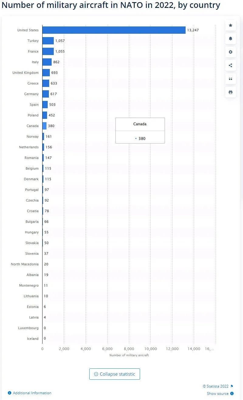 根據全球數據統計公司statista提供的最新數據,當前北約一共擁有約2萬架軍用飛機,美國的軍機數量最多,為13247架;但接下來就斷崖式下降,排名第二的土耳其為1057架,法國第三(1055架),意大利第四(862架),英國第五(693架)。尤其值得一提的是,多達15個北約國家的軍機數目為兩位數甚至更少,其中盧森堡和冰島為0。