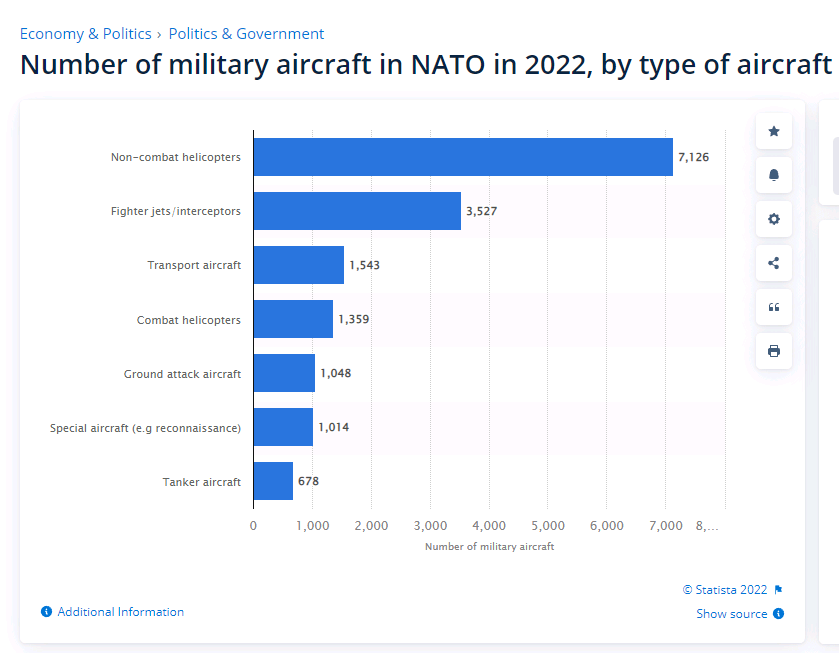 如果按照軍機種類來算,北約能夠支援烏克蘭的戰機情況更糟糕了。相關統計顯示,北約軍機數量最多是非武裝直升機(7126架),戰鬥機和截擊機僅有3527架,其餘的都是運輸機、武裝直升機和特種飛機等。