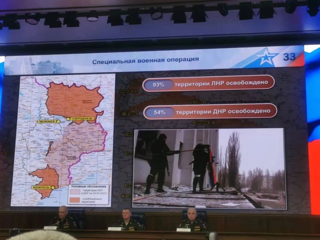 當地時間25日,俄羅斯國防部在新聞發佈會上表示,俄軍在烏克蘭的軍事行動總體上第一階段行動的主要任務已經完成, 接下來將集中力量徹底解放頓巴斯地區。俄國防部還表示,將避免平民不必要的傷亡作為第一要務,軍事基礎設施和武器裝備被高精度武器精準摧毀。
