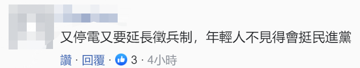 另有網友提起此前就曾引發爭議的事件,“又停電又要延長征兵制,年輕人不見得會挺民進黨”。↓