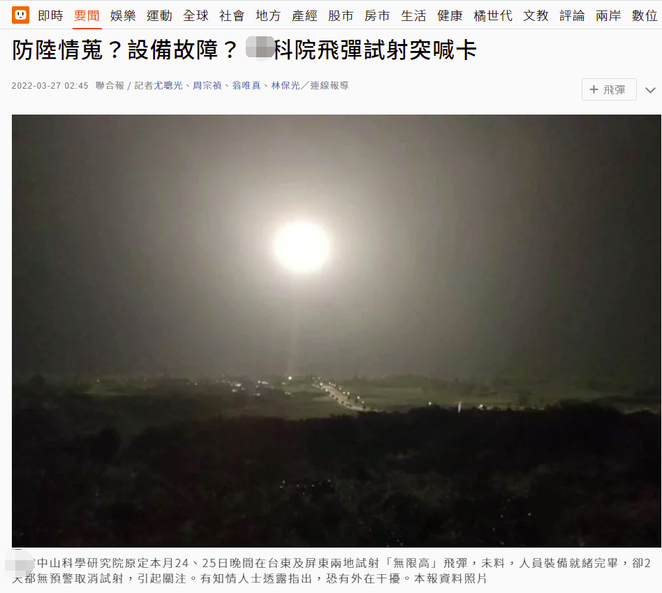據“聯合新聞網”、《自由時報》等台媒報道,根據台“漁業署”公告射擊通報,台“中科院”在本月24日、25日,及28日、29日晚間7時40分到9時10分在台東及屏東沿海空域進行試射,最大高度為“無限高”。一般來説,雖然排定4天,但會依實際狀況,僅在其中一天進行試射,即完成當次任務。不過原定24日、25日晚在台東及屏東兩地試射“無限高”導彈,相關人員裝備就緒,連台東警消也配合出勤管制,未料接連兩天竟無預警取消試射。