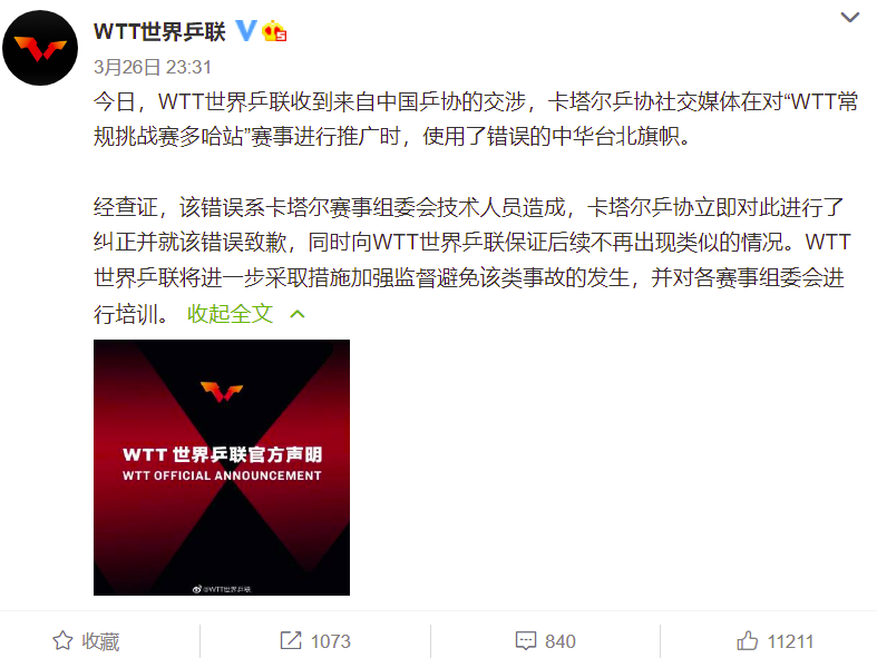 【環球網報道】北京時間3月26日深夜,世界乒乓球職業大聯盟官方微博@WTT世界乒聯 發文稱,卡塔爾乒協社交媒體在對“WTT常規挑戰賽多哈站”賽事進行推廣時,使用了錯誤的中華台北旗幟,該錯誤系卡塔爾賽事組委會技術人員造成,卡塔爾乒協立即對此進行了糾正並就該錯誤致歉。