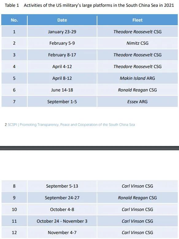 根據公開資料,美國海軍航母打擊羣與兩棲戒備羣等大型艦艇編隊2021年共進入南海12次。除了上述11月4日“卡爾·文森”號航母打擊羣進入南海活動之外,在其他幾次美國大型作戰艦艇進南海之前,也有着美國海軍大型偵察船在相關海域活動、作業的情況。