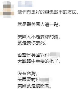“更好的避免戰爭的方法,就是離美國遠一點”,有島內網友在台媒評論區留言表示,美國人不是要你的錢,就是要你去死,台灣是美國對付大陸重要的棋子。