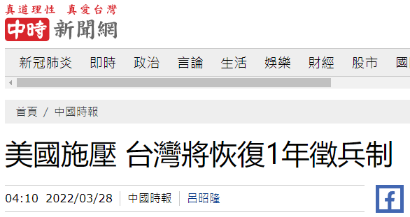 台媒稱美施壓下台灣將恢復1年徵兵制,網友:更好的避戰方法是離美國遠點