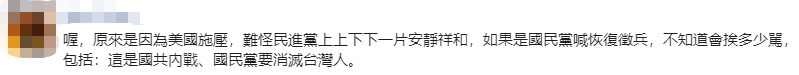 有網友嘲諷,“原來是因為美國施壓,難怪民進黨上上下下一片安靜祥和,如果是國民黨喊恢復徵兵,不知道會挨多少罵。”